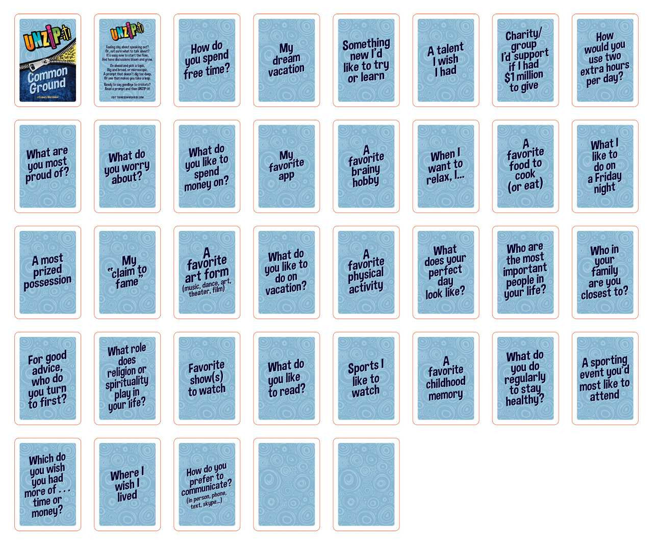 As you try to generate conversation and build new friendships and relationships, a key challenge is finding “common ground” experiences and interests that you share with others. This deck helps to uncover these commonalities. (Click on the card images above to see the prompts)
