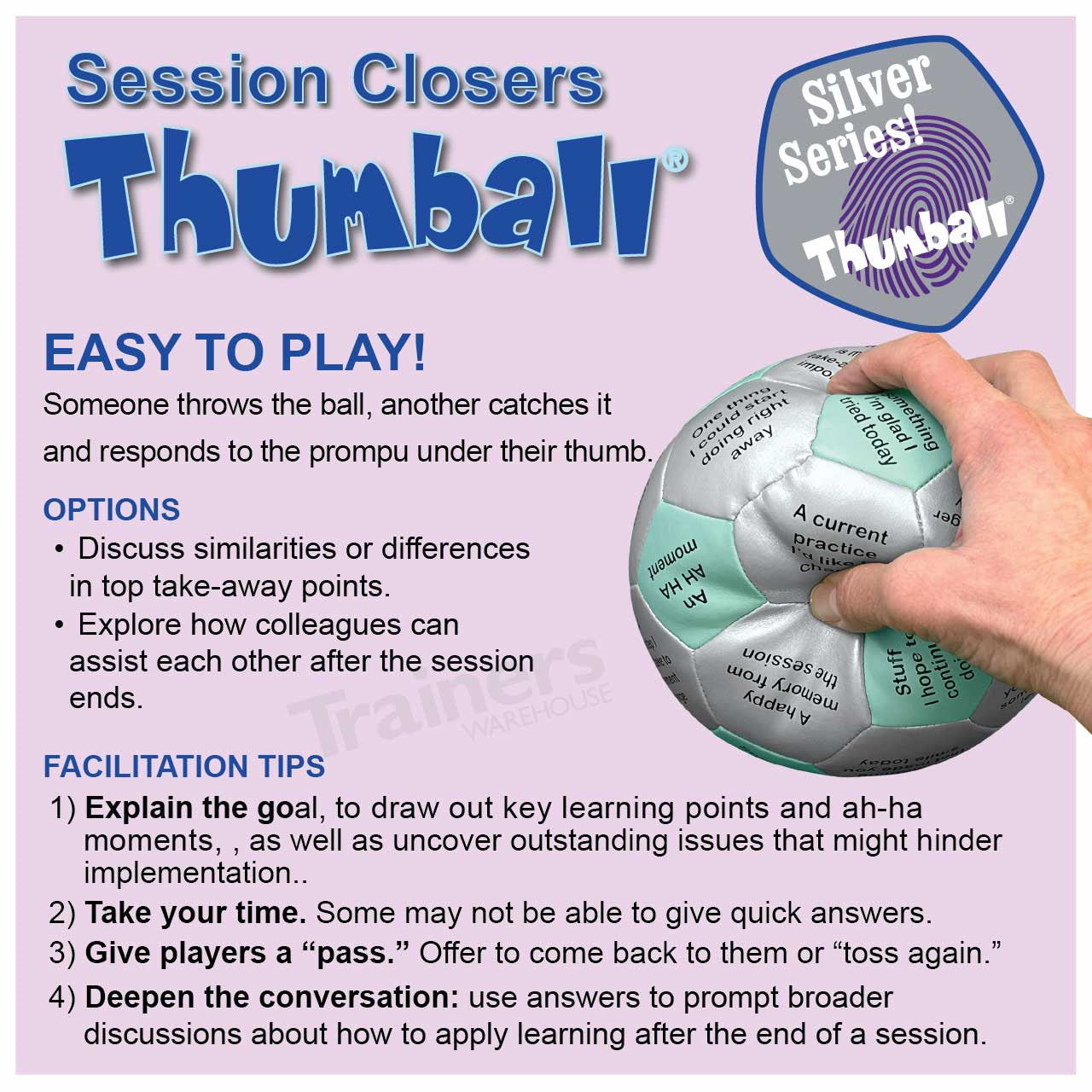 The Session Closers Thumball offers a variety of memory-enhancing techniques. Understand that our brains aren't equipped to remember every single thought that enters. Instead, we remember what we take time to think about. Each of the prompts on this one-of-a-kind Thumball seeks to enhance retention by highlighting memorable points for participants, making them consider goals or challenges of implementation, heightening the emotional impact of the session, and more.
