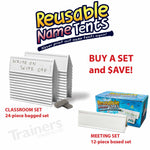 Set of 24 Reusable Dry-Erase Tent Cards with markers and mini-erasers is the eco-friendly, professional solution for name tents at trainings, workshops, and classrooms. Each sturdy, molded table tent can be written on, again and again—no more wasting paper or printing new signs for every event. Large dry-erase tent cards for conferences are high-quality, two-sided, 4" H x 11" L x 3"D molded plastic whiteboard tents that let groups see names from the front or the back of the room. Their molded construction makes stacking and storage easier than ever. Use them again and again with any dry-erase markers. They clean up instantly and completely! Moreover, participants can be called by their preferred name, not the name that happens to be on your roster!