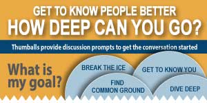 - Thumballs. These require players to toss a ball, catch it, and respond to the prompt under their thumb. When using one of the trainer resources like this, consider how well the group knows each other and what sort of discussion topics would be welcome. Do you need to avoid uncomfortable silences? Get to know each other better? Or, dig into discussions about Stress, Diversity, Goals, Team Dynamics, etc.?